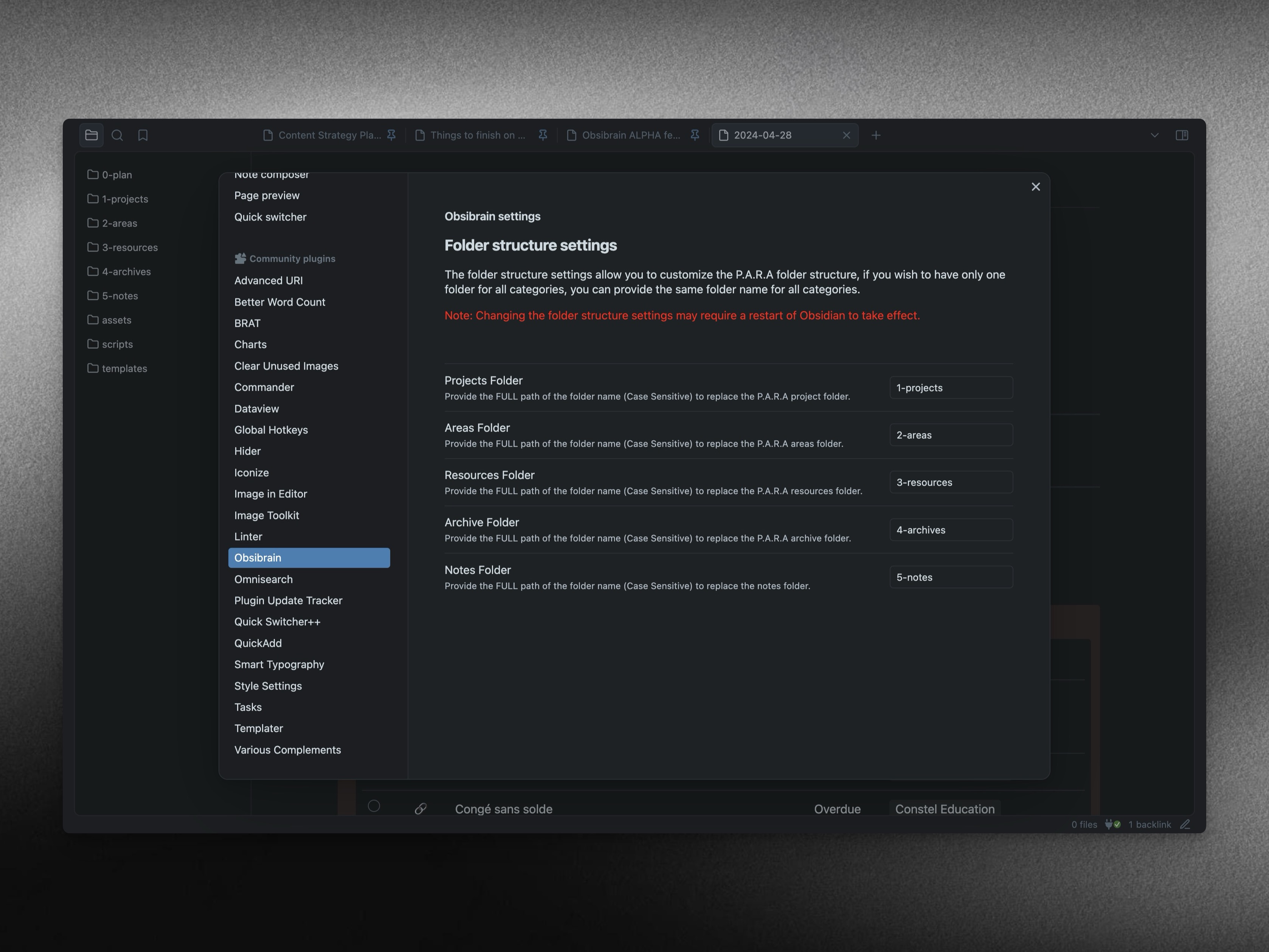 Obsibrain now has its own dedicated settings section in Obsidian. You can customize the folder structure of your Obsibrain template directly from the settings.