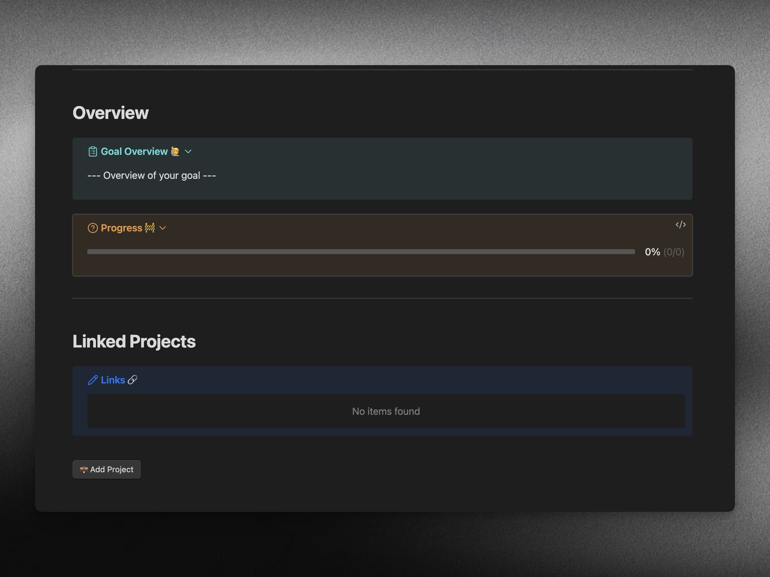 The first section of the template offers an "Overview of your goal," where you can add additional details, nortes, and track the overall progress.