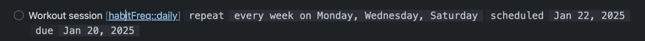 Note: You can manually edit the habit's frequency by modifying the habitFreq property inline. This flexibility is particularly useful for specific scheduling needs. For example, if you have a workout routine on Monday, Wednesday, and Friday, you might prefer to set it as a daily habit view for better tracking.