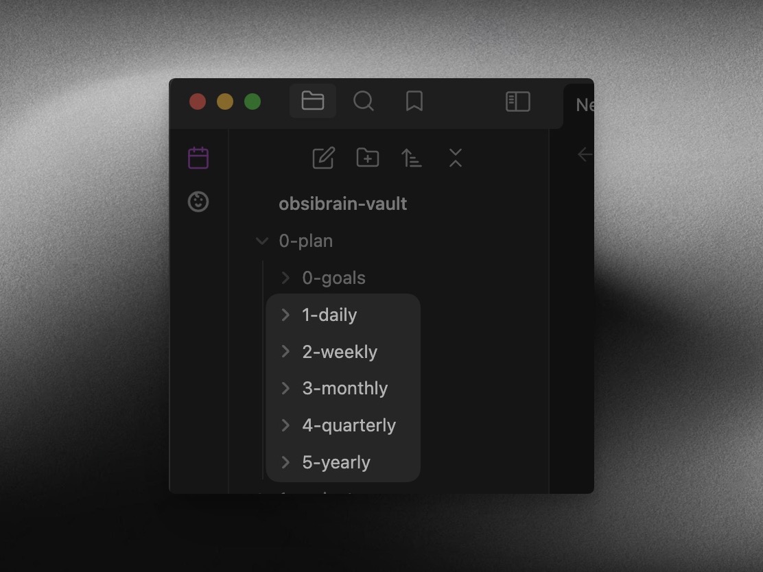 To access the periodic review features, simply navigate to the 0-plan section of your Obsibrain vault, as shown in Screen 1. Here, you'll find a variety of review options, including daily, weekly, monthly, quarterly, and yearly reviews.