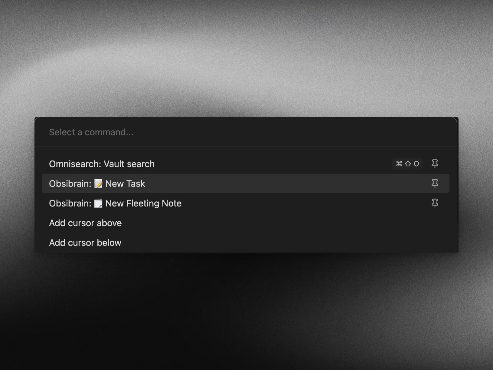 To quickly add a new task, simply open the command palette (using the keyboard shortcut Ctrl/Cmd + P) and search for "Obsibrain: New Task" (pinned by default). This will bring up a modal where you can enter the task details, as shown in Screen 1.