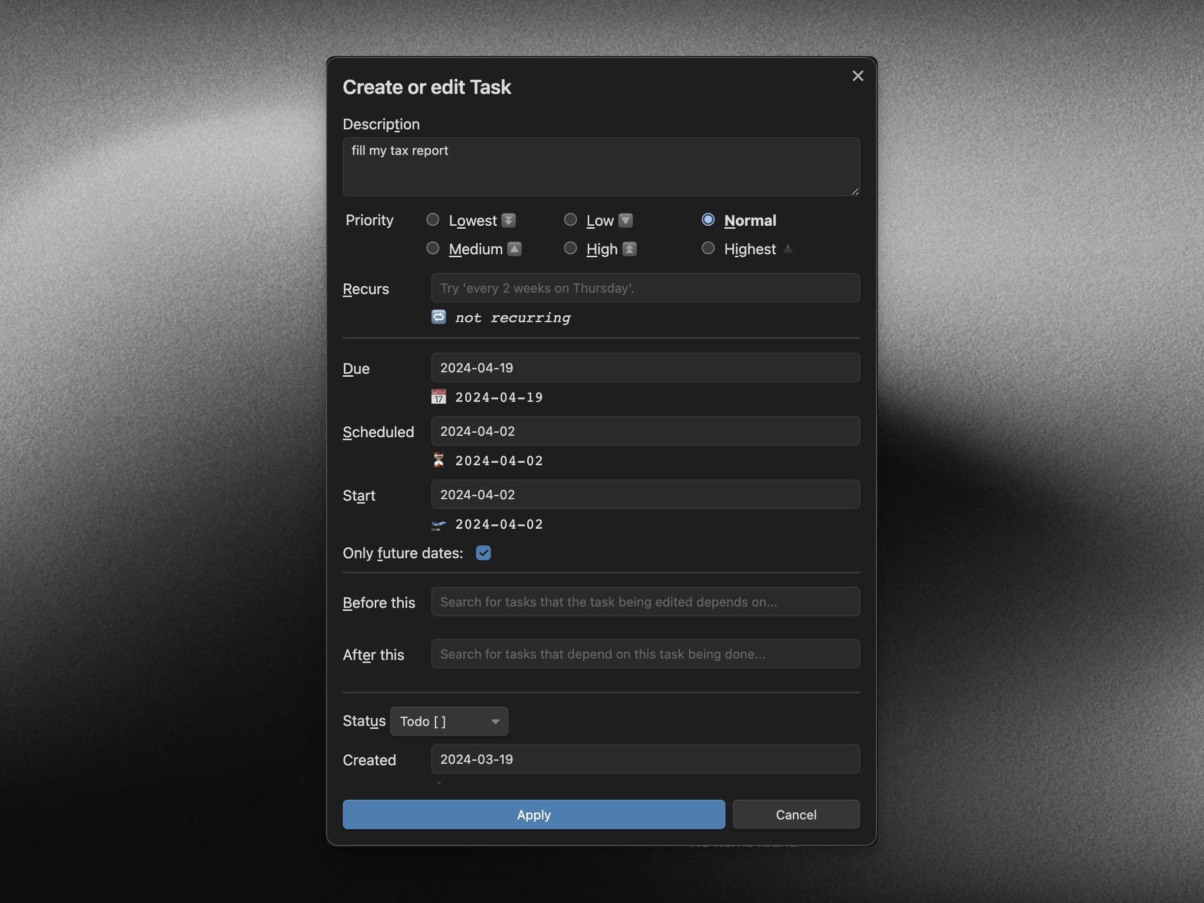 - Scheduled (optional): when the task is scheduled to start work on (Leave empty to skip)