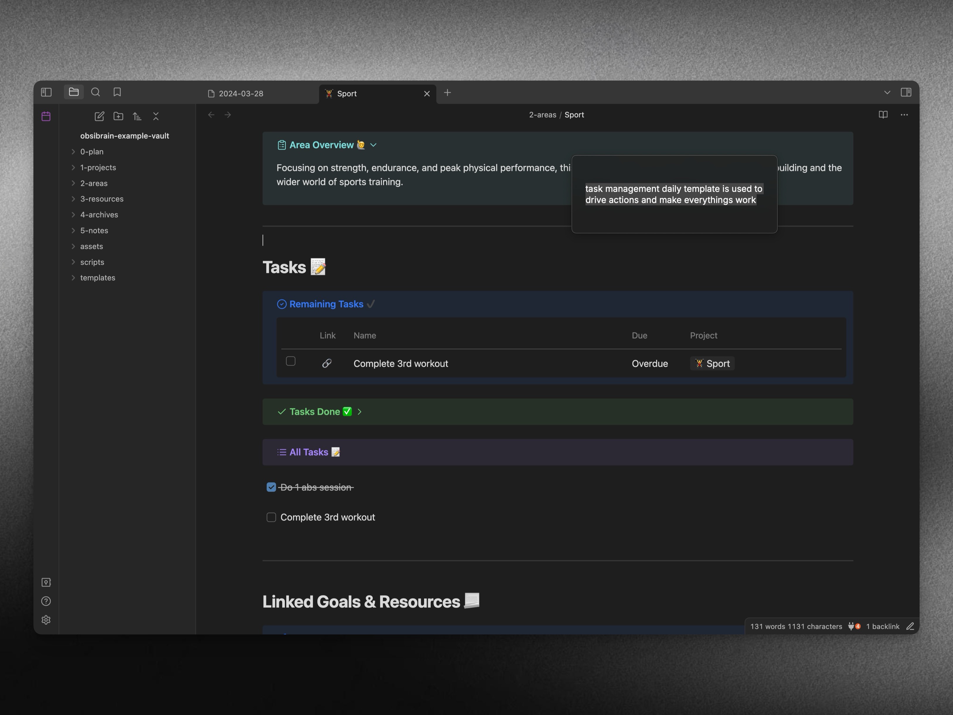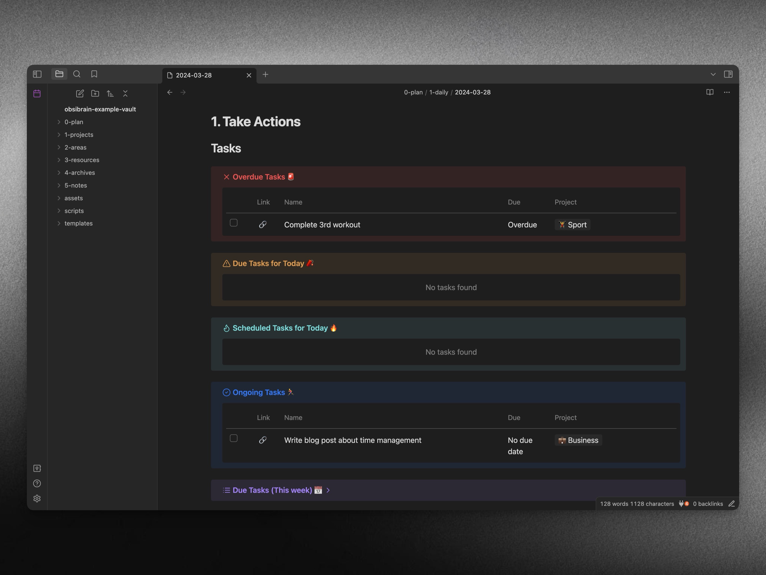 Obsibrain's task management system is integrated throughout the entire P.A.R.A. folder structure. This means you can easily view and manage all your tasks, regardless of which project, area, or resource they are associated with.